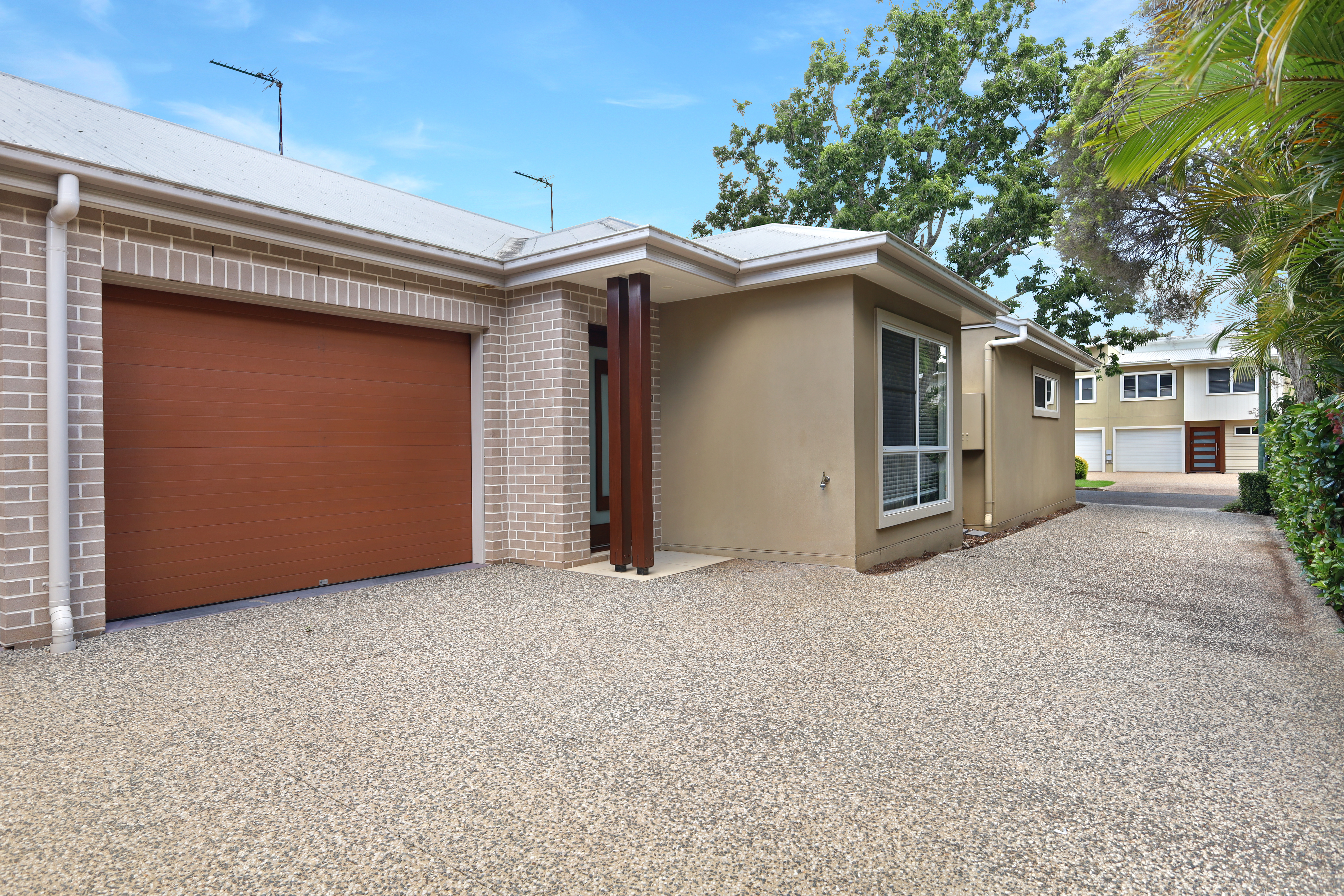 - Arriving at Unit 2, notice the striking deep-resin timber porch posts and tone of the front, which together echo the rich garage door tone, beautifully complementing the brick and render elements