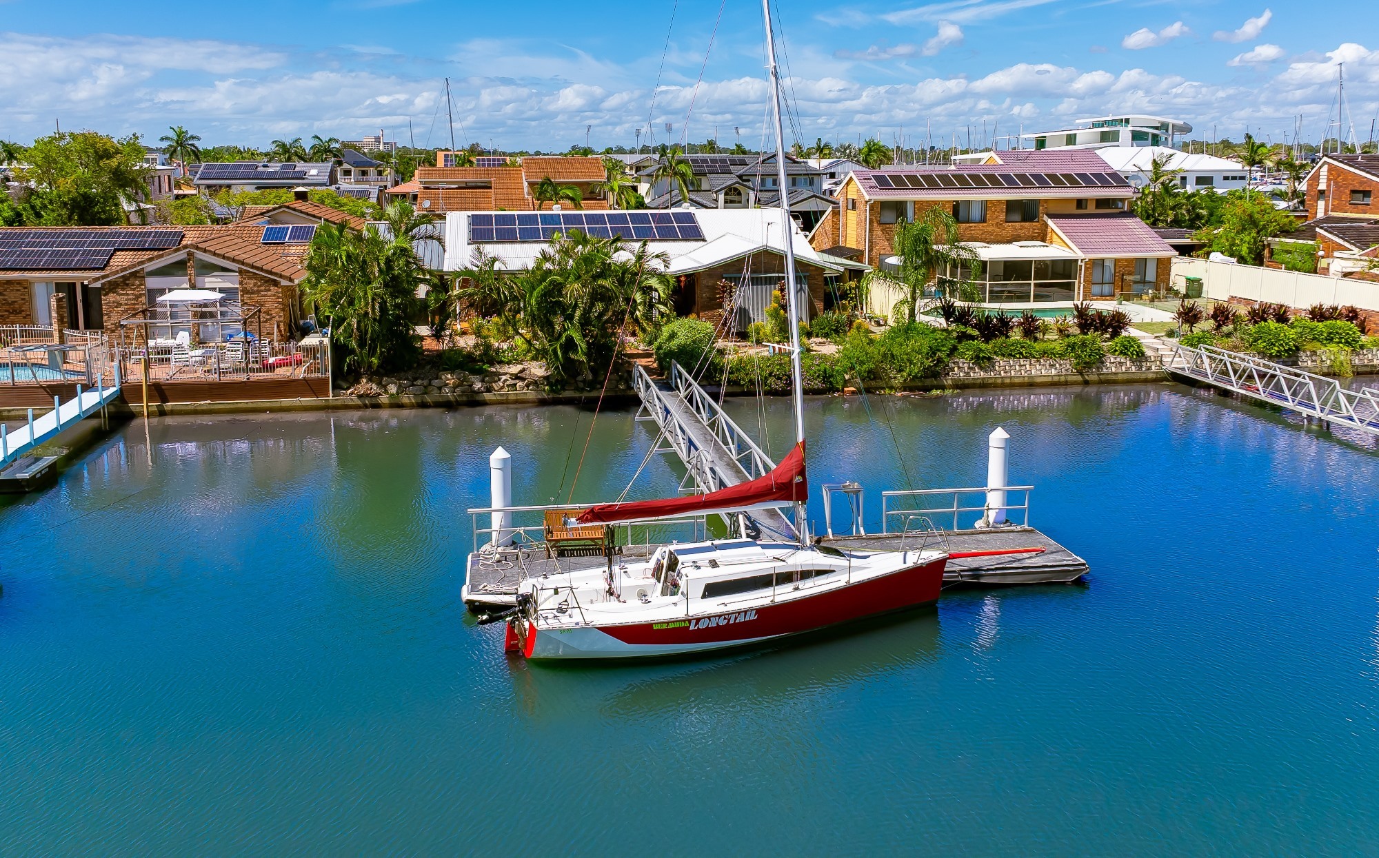 The 754 sqm land offers a wide frontage and quay lines and easy boating access from the 12 metre pontoon to the main (Albatross) canal and the open waters of Moreton Bay and beyond.