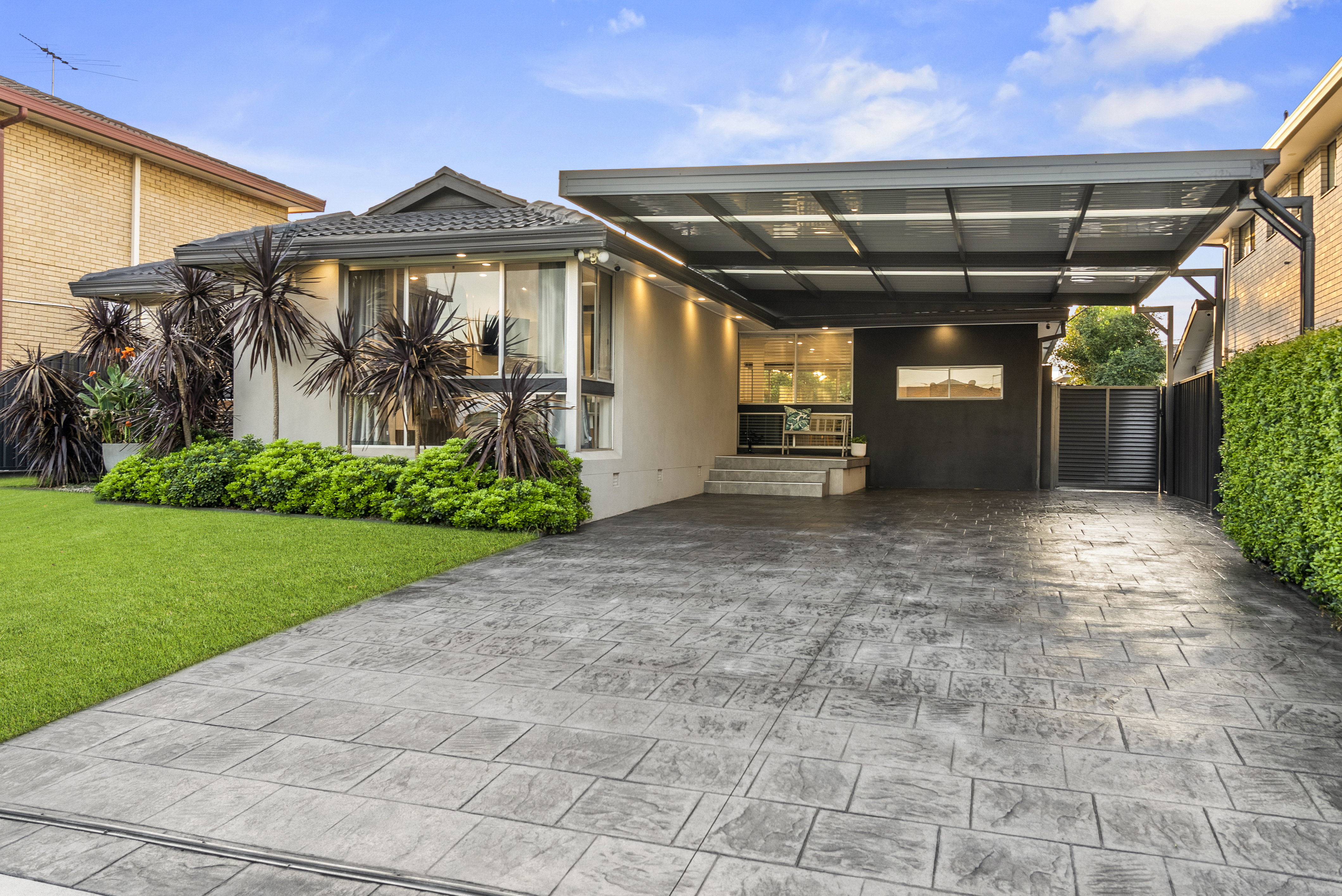 Description: Set on a manicured 556.4 sqm parcel with wide 16.46 metre street frontage, this stunning single-level family home offers an exceptional contemporary lifestyle for modern day living. Boasting a sunny open-plan design with separate lounge and dining spaces, the residence includes ducted air-conditioning, premium easy-care flooring plus energy efficient LED lighting to guarantee comfort through all weather conditions. Featuring a designer gas kitchen with stainless steel dishwasher and wide 900mm oven with gas cooktop, a large master bathroom with dual vanity and standalone tub, generous internal laundry, plus built-in robes in three bedrooms with the master inclusive of a private ensuite bathroom. Entertainers will love the oversized covered entertaining area with ceiling fans adjoining the private rear yard as the perfect place to relax with family and friends. Add a double carport plus additional gated off-street parking to complete this comprehensive lifestyle package. Just over 250 metres to the bus stop, you're an easy walk to school, Merrylands Bowling Club, church and Merrylands Road shopping. |